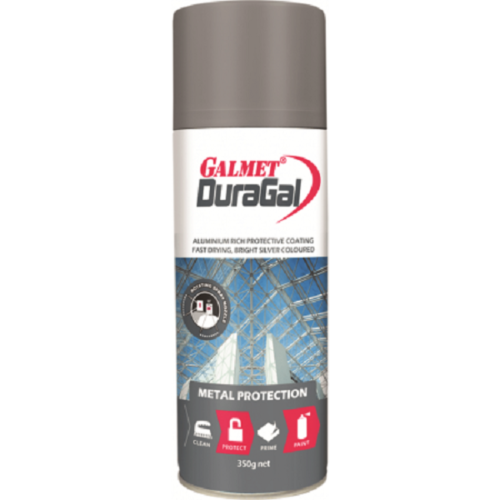 GALMET DURAGAL® SILVER PAINT IS A QUICK DRYING SOLVENT-BASED SPRAY SYSTEM FORMULATED TO PROVIDE CORROSION RESISTANCE TO DURAGAL® WELDS, & OTHER IRON & STEEL PRODUCTS GIVING THE APPEARANCE OF A NEW DURAGAL® SURFACE.