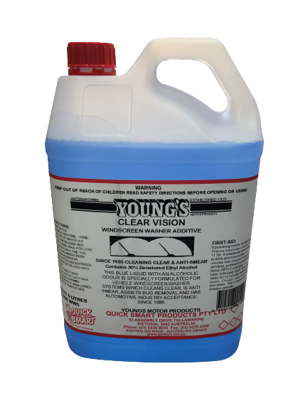 YOUNG’S CLEAR VISION WINDSCREEN WASHER IS SPECIALLY FORMULATED CONCENTRATE FOR USE IN VEHICLE WINDSCREEN WASHER SYSTEMS. YOUNG’S CLEAR VISION CLEANS CLEAR, IS ANTI-SMEAR, ASSISTS IN THE REMOVAL OF BUGS & HAS AUTOMOTIVE INDUSTRY ACCEPTANCE SINCE 1985.
