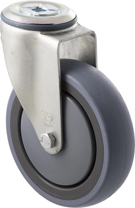 THE STQ125G/MZH CASTOR HAS A GREY RUBBER WHEEL WITH A DIAMETER OF 125 MM, & A MAXIMUM LOAD CAPACITY OF 100 KG PER CASTOR.