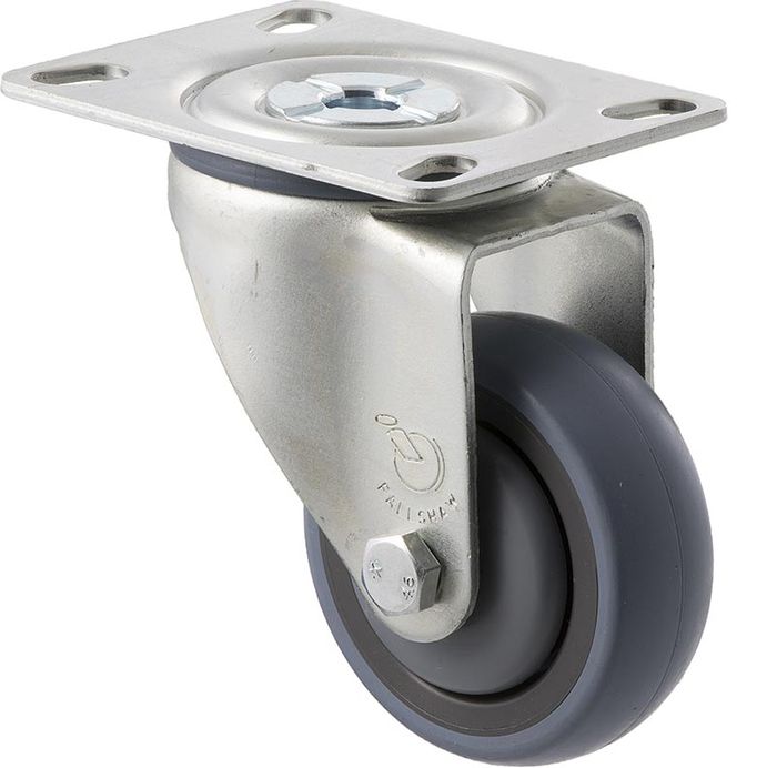 THE STQ75G/MZPN CASTOR HAS A GREY RUBBER, ENERGY ABSORBENT WHEEL WITH A DIAMETER OF 75 MM, & A MAXIMUM LOAD CAPACITY OF 100 KG PER CASTOR.