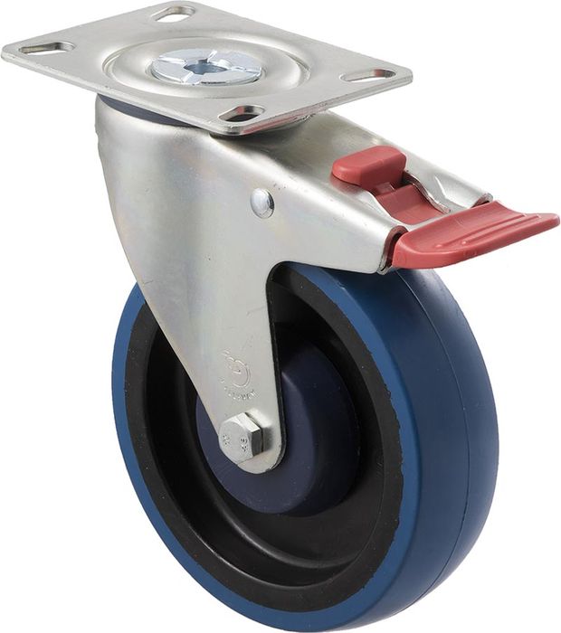 THE MBQ125G/MZPNTB CASTOR HAS A BLUE HIGH RESILIENCE RUBBER WHEEL WITH A DIAMETER OF 125 MM, & A MAXIMUM LOAD CAPACITY OF 150 KG PER CASTOR.