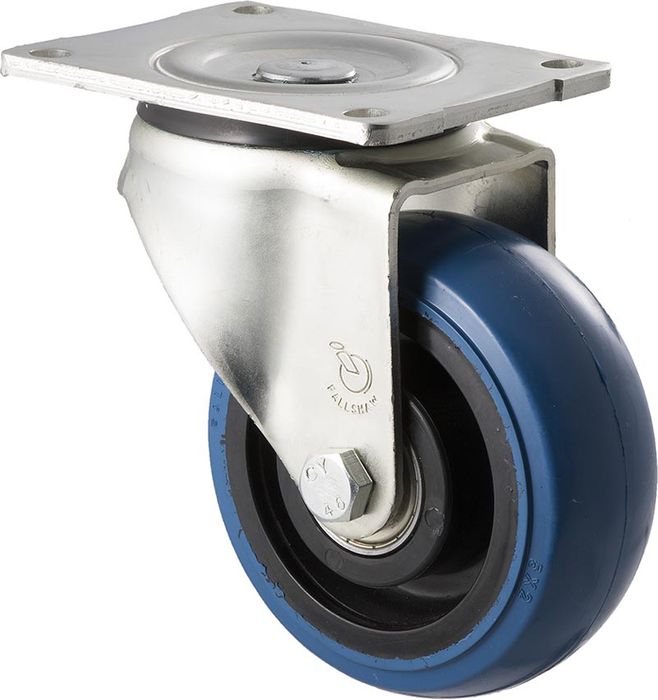 THE OBQ125/OZP CASTOR HAS A BLUE HIGH RESILIENCE RUBBER WHEEL WITH A DIAMETER OF 125 MM, & A MAXIMUM LOAD CAPACITY OF 350 KG PER CASTOR.