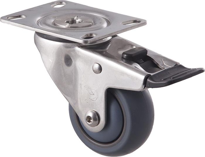 THE MJA75G/MSPTB CASTOR HAS A THERMOPLASTIC ELASTOMER (TPE) WHEEL WITH A DIAMETER OF 75 MM, & A MAXIMUM LOAD CAPACITY OF 85 KG PER CASTOR.