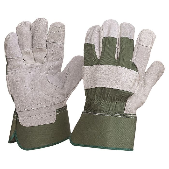 EXTRA HEAVY DUTY COW SPLIT LEATHER REINFORCED PALM, THUMB & FINGERS FOR EXTENDED TOUGHNESS & DURABILITY. SAFETY CUFF & KNUCKLE BAR FOR ADDED PROTECTION