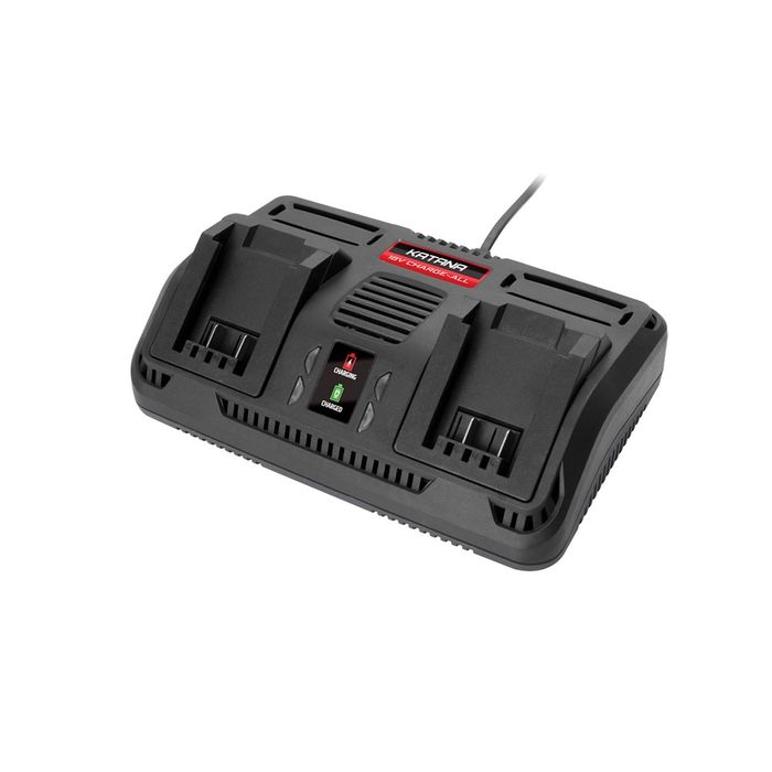 DESIGNED TO WORK WITH ALL KATANA 18V CHARGE-ALL LI-ION BATTERIES. THE TWIN PORT CHARGER FEATURES LED CHARGE INDICATORS THAT SHOW THE CHARGE STATE OF THE BATTERY. RED = CHARGING, GREEN= CHARGED (OR NO BATTERY INSERTED).