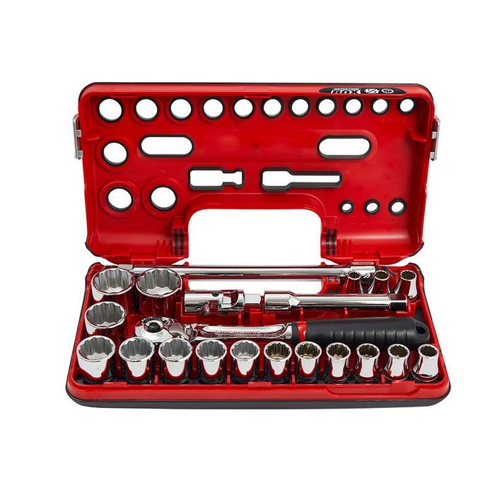 Includes:17 X METRIC SOCKETS: 8MM, 10MM, 11MM, 12MM, 13MM, 14MM, 15MM, 16MM, 17MM, 18MM, 19MM, 21MM, 22MM, 24MM, 27MM, 30MM, 32MM. 1 X MAINTENANCE FREE COMPACT HEAD RATCHET. 2 X EXTENSIONS: 125MM & 250MM. 1 X UNIVERSAL JOINT