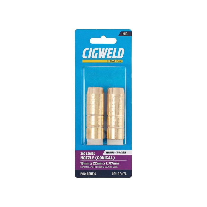 - CIGWELD BERNARD 300 SERIES NOZZLE (CONICAL) 16MM X 22MM L:67MM 2PK