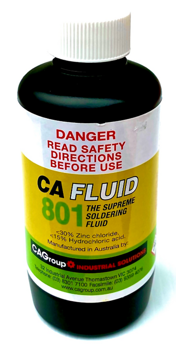 THE CA 801 250ML LIQUID IS FOR SOLDERING COPPER, BRASS AND BRONZE AS WELL AS STAINLESS STEEL, MONEL AND NICKEL CHROMIUM.