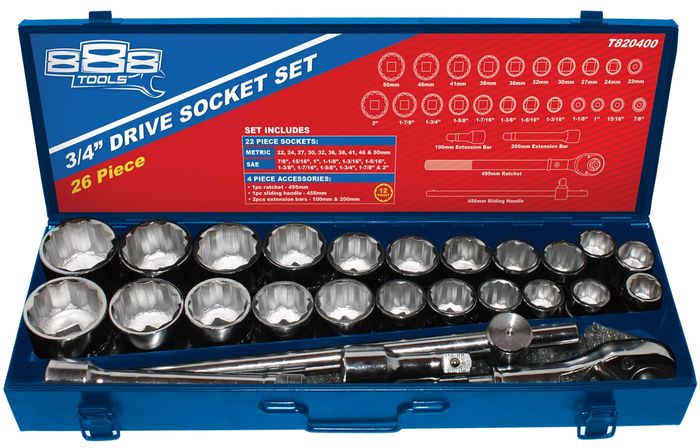 - 888 TOOLS 3/4" DRIVE SOCKET SET (12PT METRIC/SAE) - 26 PCE